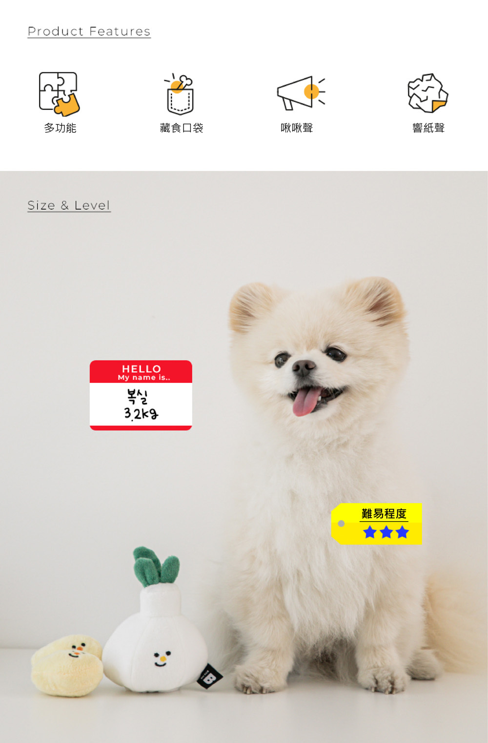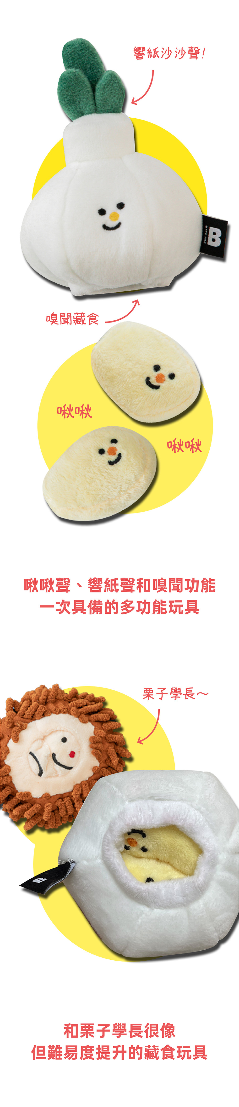 有啾啾聲、響紙聲和藏食嗅聞功能,一次具備多種功能的玩具。