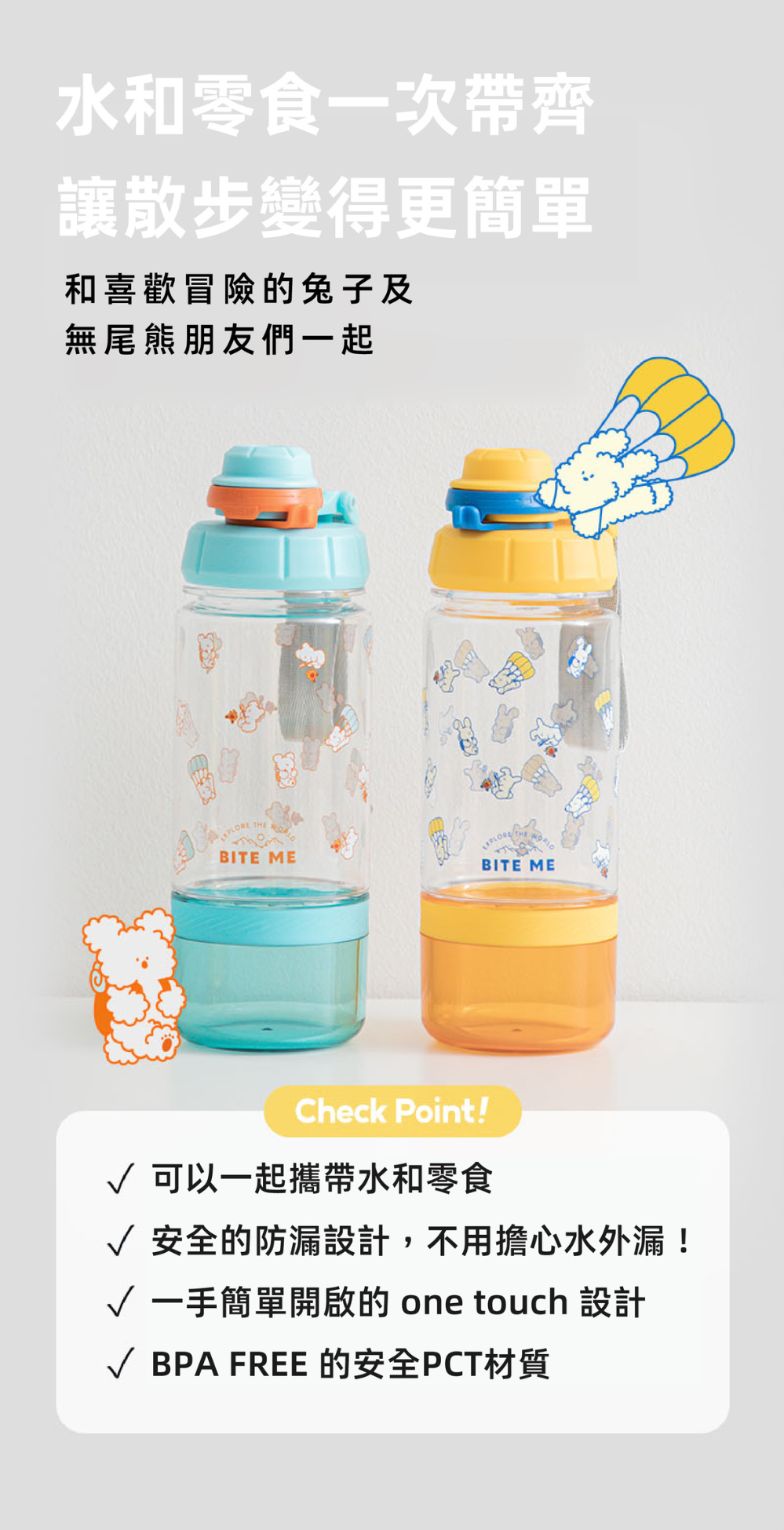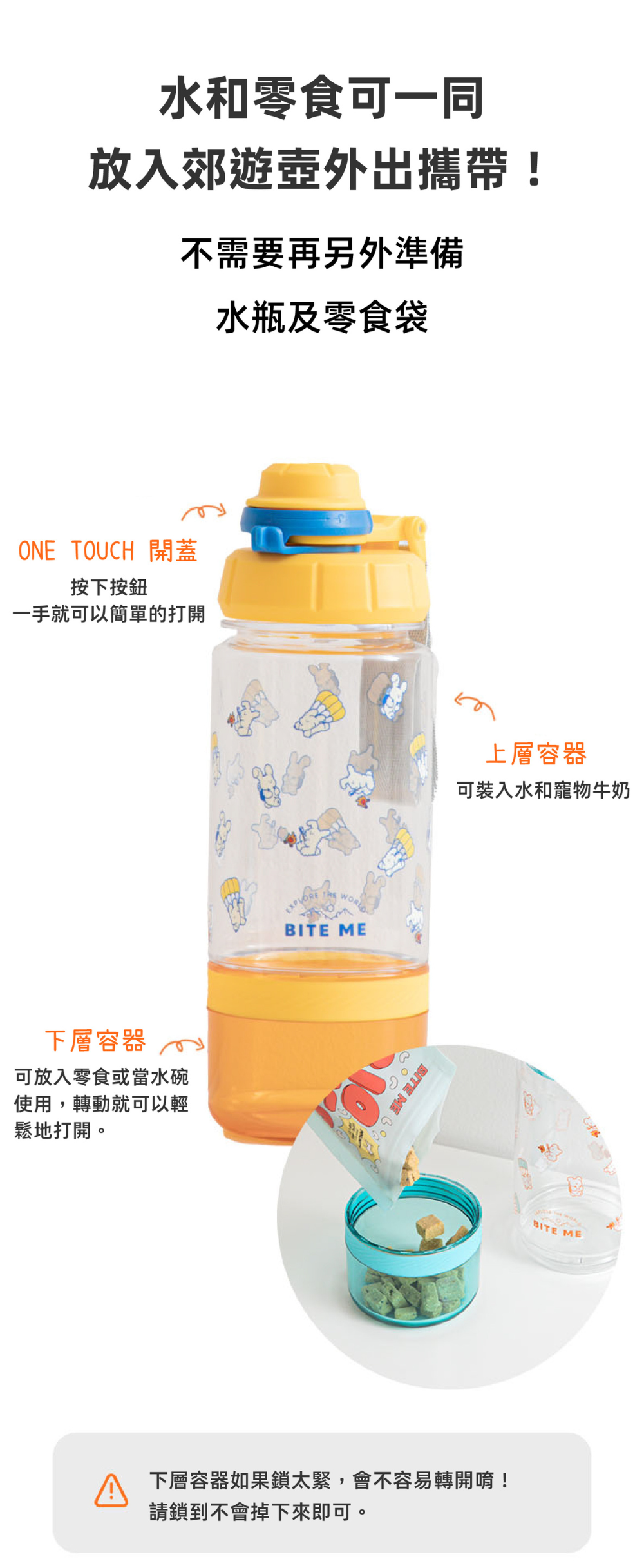 ● 水和零食一次帶齊,讓散步變得更簡單!
