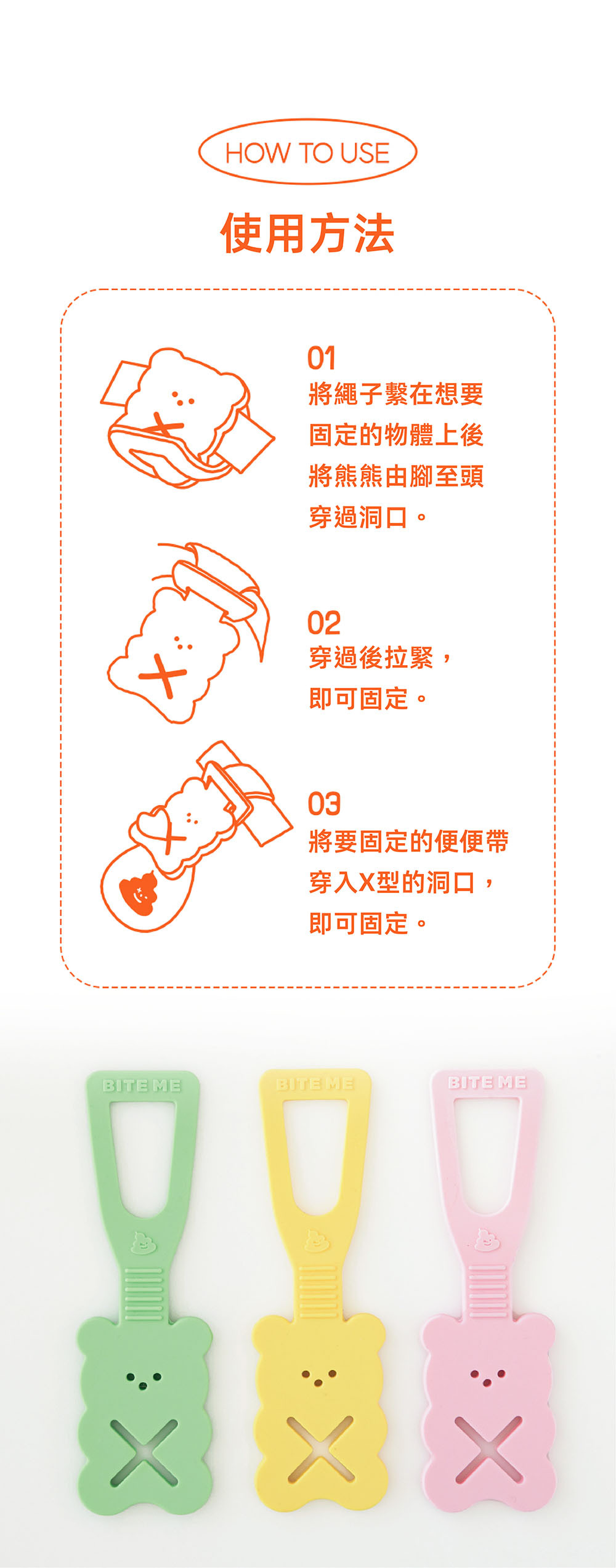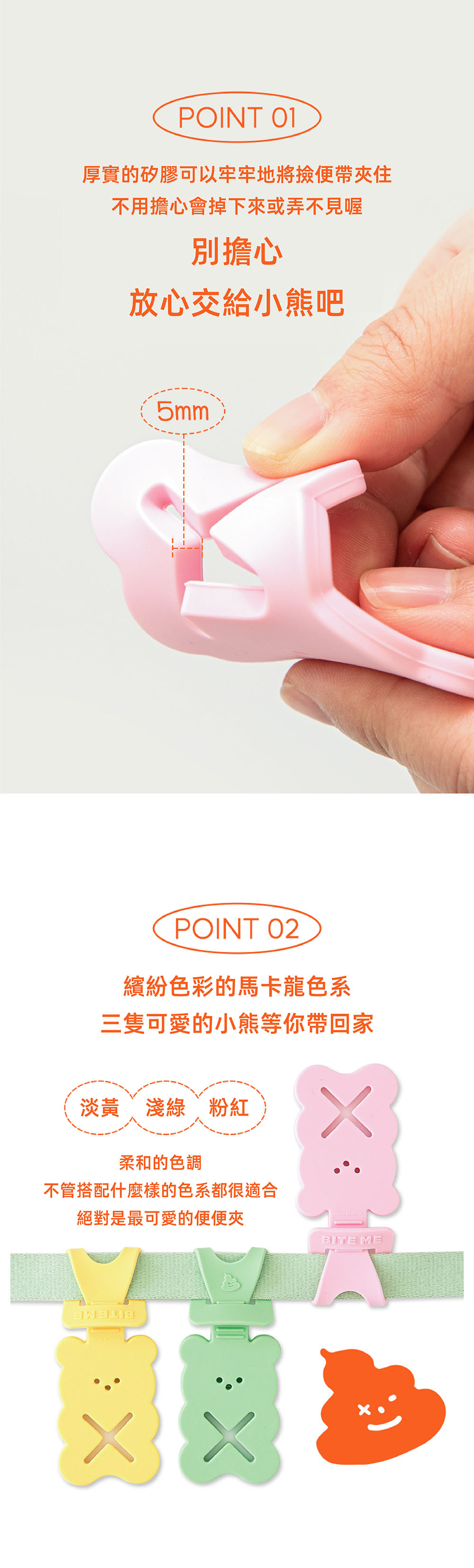 三種繽紛色彩的馬卡龍色系,5mm厚實矽膠可以牢牢的夾住撿便袋,
