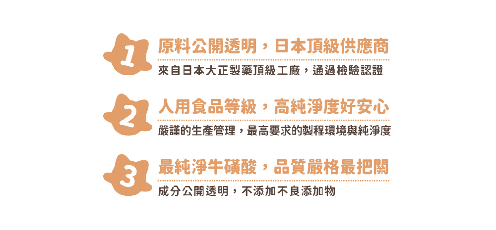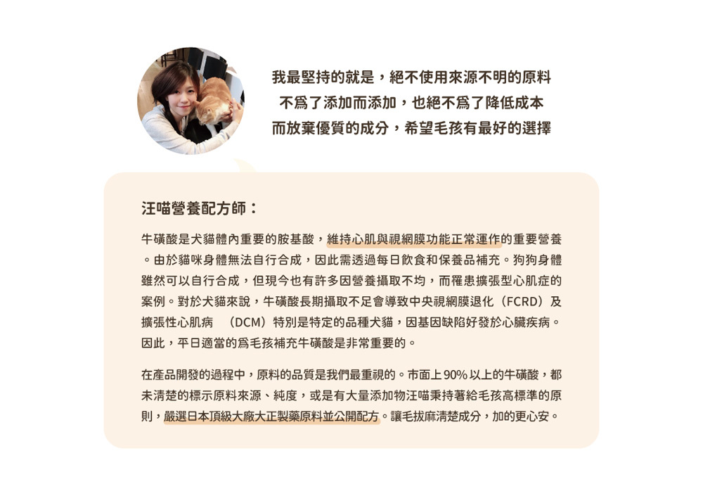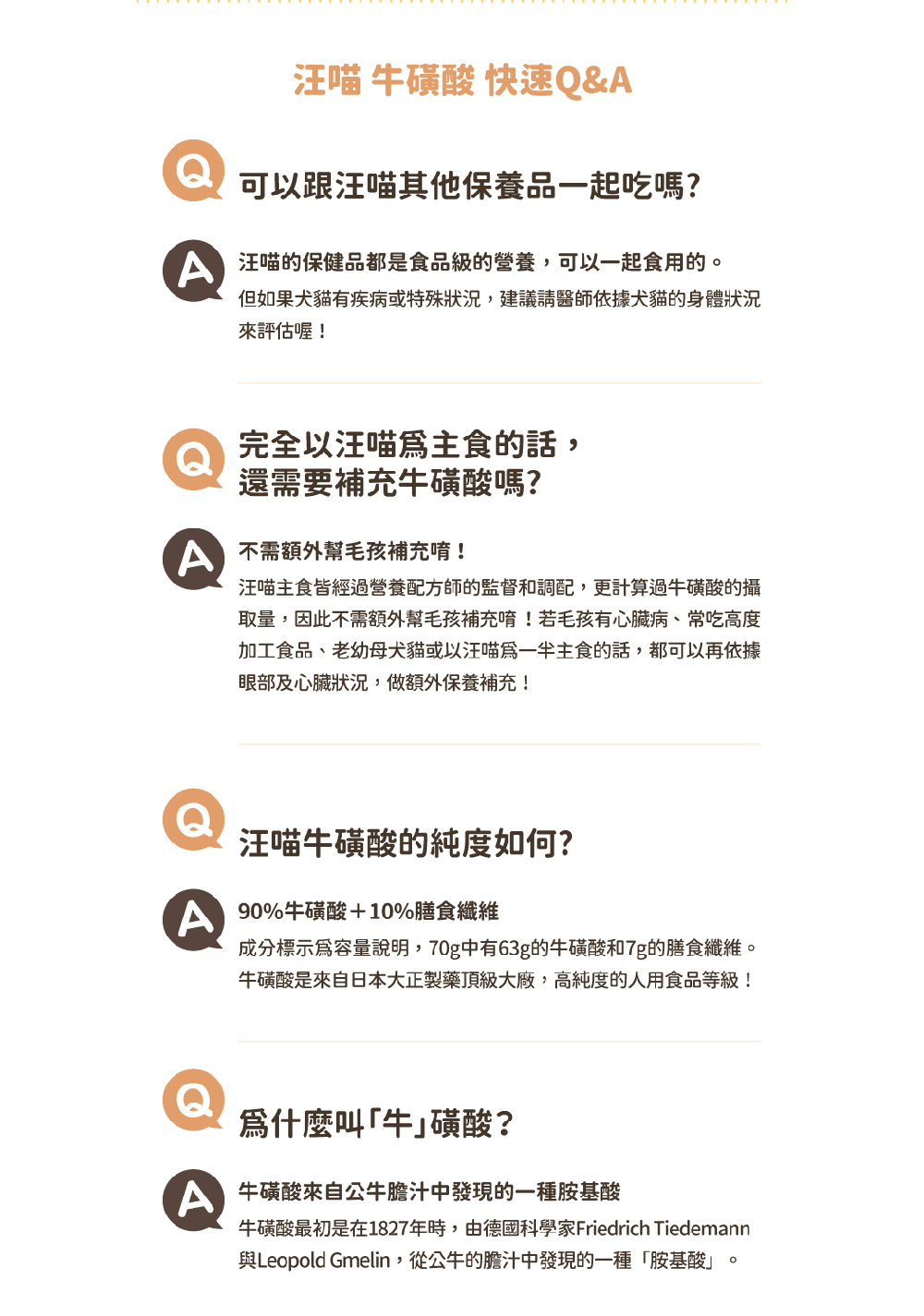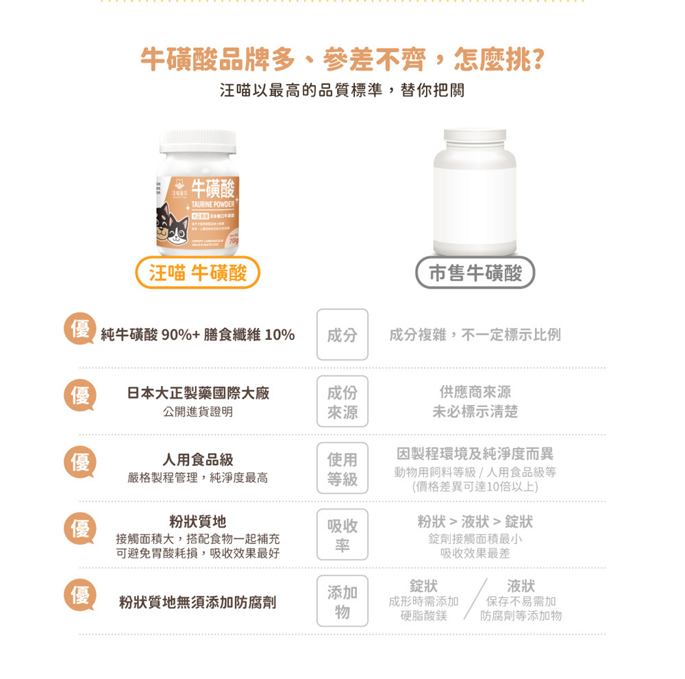 ● 市售90%以上的牛磺酸原料來源不明、或來自中國,汪喵選擇來自日本 KASANO 有檢驗報告的純牛磺酸,搭配 10% 的膳食纖維打造!